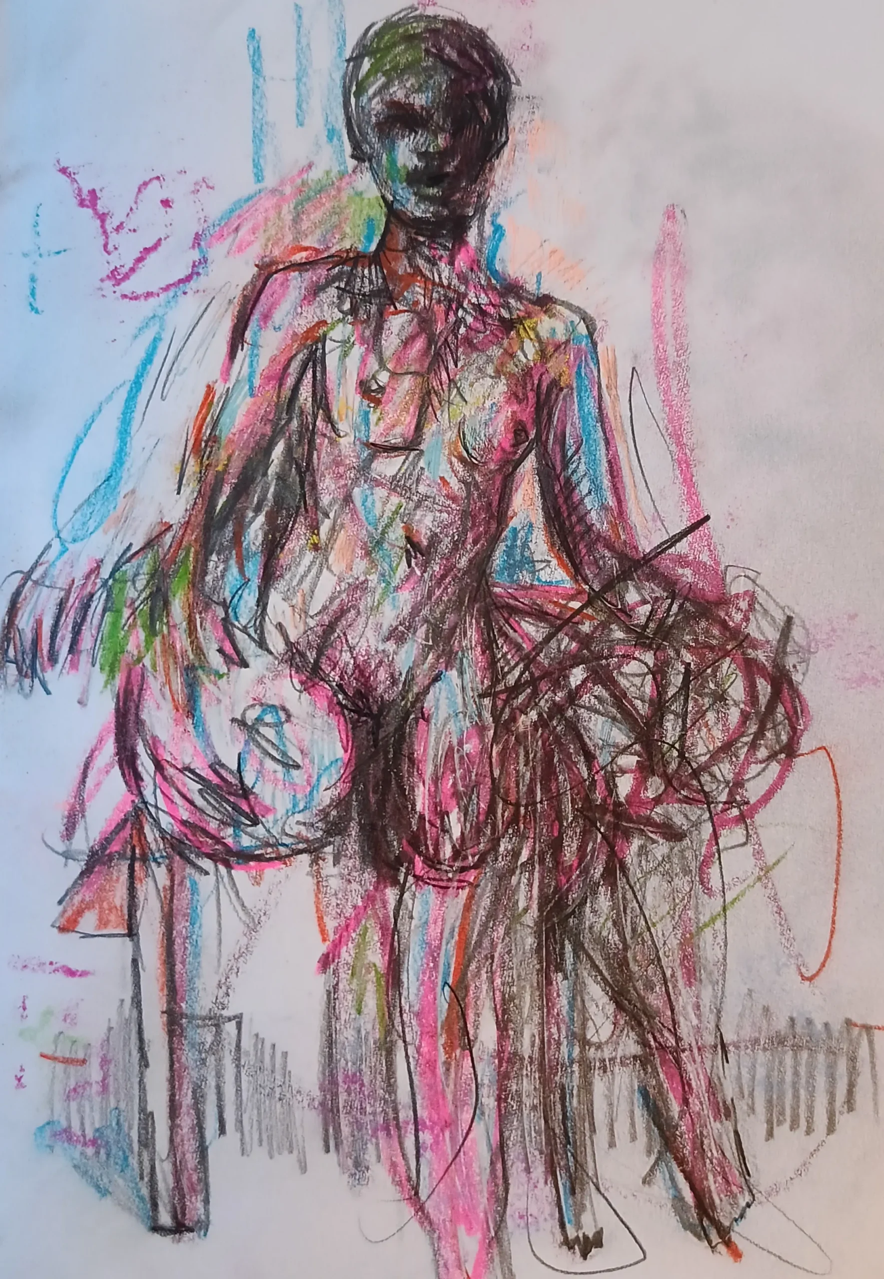 A sketch of an expressive nude in motion blur and distortion, using bold fluorescent colors across mixed media.